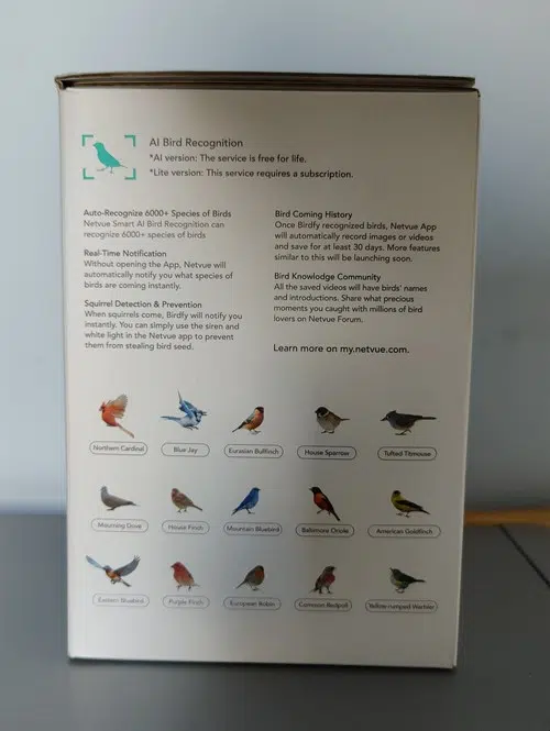 Le packaging proposé par Netvue est soigné et il présente l'avantage de nous donner un bon aperçu sur le visuel du produit, ainsi que sur les fonctionnalités. Sans surprise, Netvue met en avant sa fonctionnalité de reconnaissance des oiseaux grâce à l'intelligence artificielle. À ce sujet, sachez que l'IA utilisée peut automatiquement reconnaitre plus de 6 000 espèces d'oiseaux différentes.
