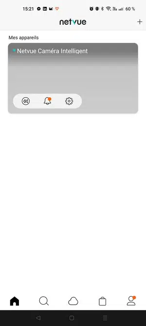 L'application Netvue intègre une section nommée "Mes appareils" dans laquelle nous retrouvons tous les appareils Netvue rattachés à notre compte. Ici, il n'y a qu'une seule caméra. Cette application permet d'accéder à l'image en direct de la caméra, ce qui permet de voir ce qu'il se passe et éventuellement d'utiliser l'audio-bidirectionnel (vous pouvez parler via le micro de votre smartphone), ou encore de déclencher la sirène.