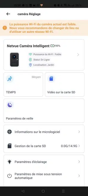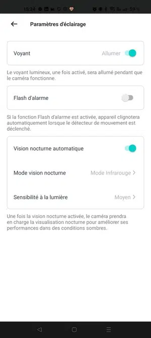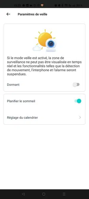L'application n'est pas la plus intuitive du marché et souffre de quelques problèmes de traduction, bien qu'elle soit disponible en français. Nous retrouvons des paramètres pour gérer le comportement de la caméra, notamment les notifications, la vision nocturne, un calendrier de mise en veille, ou encore la sensibilité du capteur de mouvement pour la détection. Vous pouvez également accéder à l'historique des mouvements détectés, jour par jour.