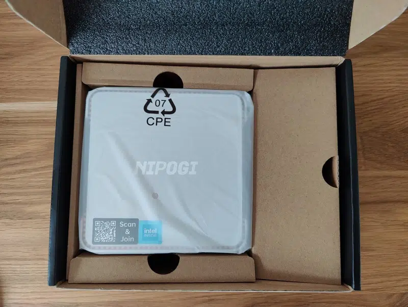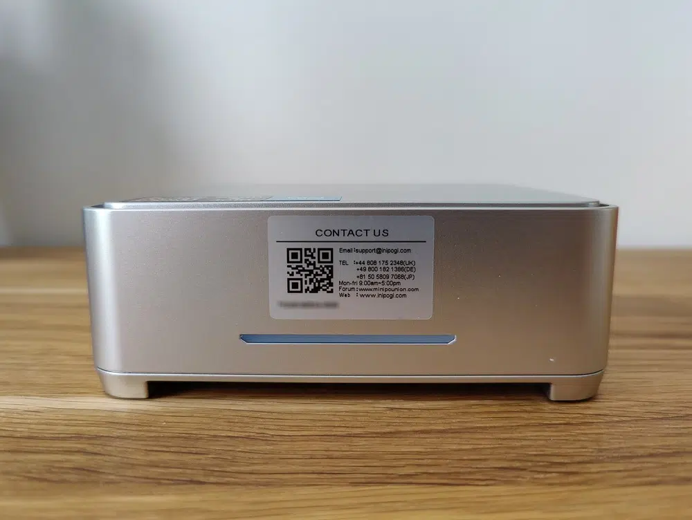 Le dessus du boitier est assez élégant, mais à mon sens, cela est gâché par les deux stickers. Il y a un sticker Intel Inside et un autre avec un QR code qui renvoie vers une page pour rejoindre le club VIP de NiPoGi. L'intérêt étant de s'inscrire pour tenter de gagner de nouveaux produits ou une extension de garantie de 12 mois.