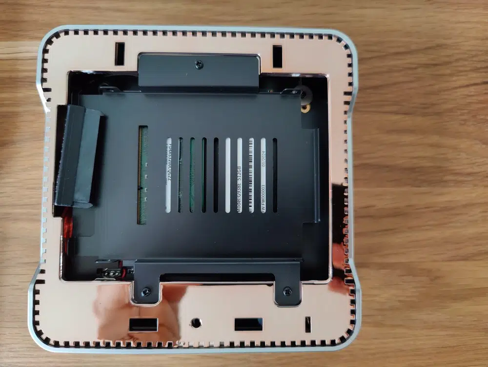 Difficile d'en apprendre plus sur les autres composants, car ils sont masqués et difficilement accessibles. Mais, nous avons accès à l'essentiel : le stockage et la RAM. C'est généralement ce que l'on est susceptible de faire évoluer sur un mini PC.
