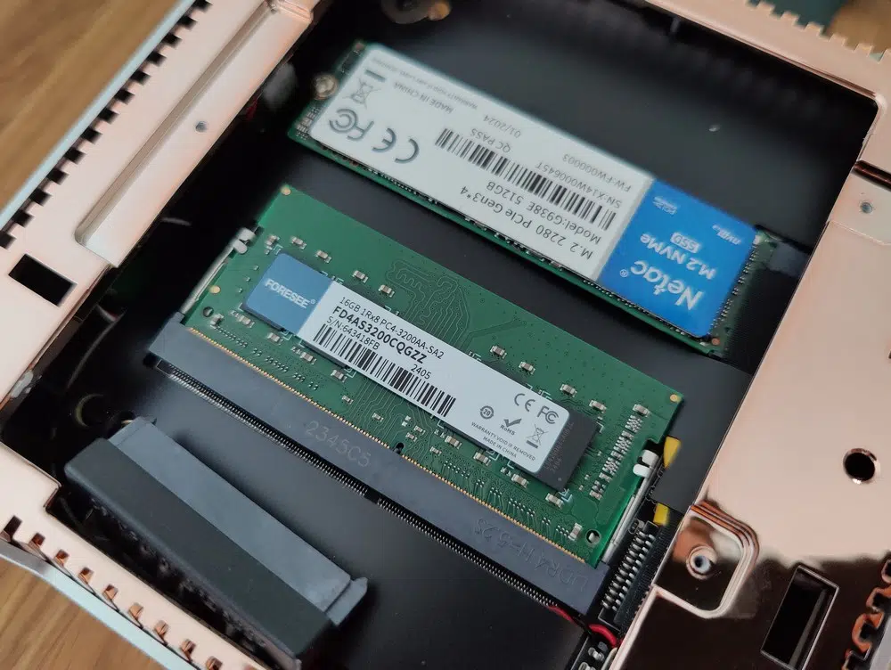 Le mini-PC est livré avec 16 Go de RAM en DDR4, sans qu'il soit possible d'effectuer une mise à niveau. Il n'y a qu'un seul slot sur la carte mère et il est occupé par une barrette de RAM de 16 Go. Ceci correspond à la quantité de RAM maximale supportée par le CPU.