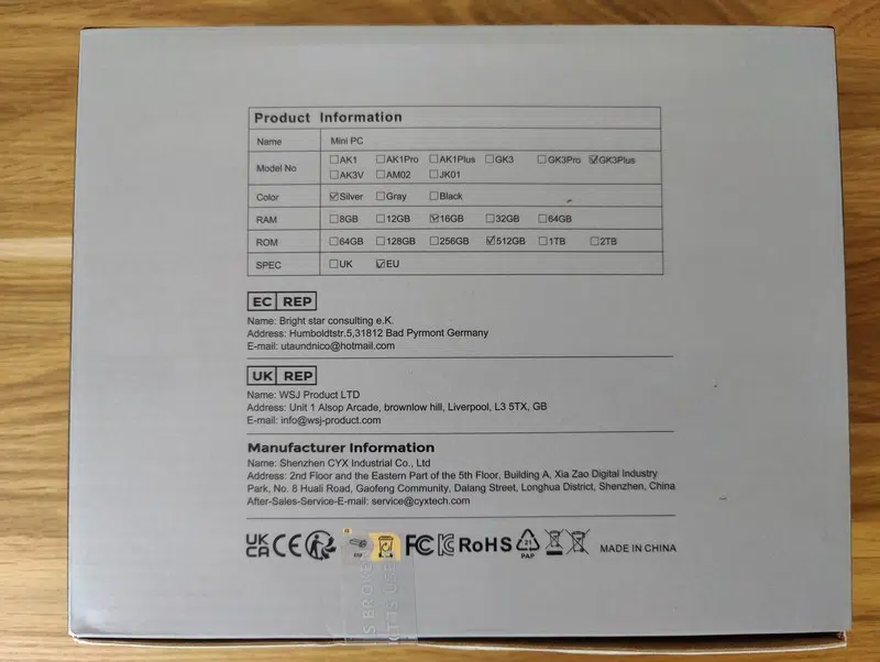 NiPoGi ne fait pas de fioriture sur le packaging de ses mini PC : la boite reste identique, et il faut regarder à l'arrière pour savoir quelle est la référence incluse dans la boite. Ici, nous pouvons constater que c'est bien un GK3 Plus avec 16 Go de RAM et 5121 Go de stockage. À l'intérieur, le mini PC et les accessoires sont correctement emballés et protégés par du carton et une plaque de mousse.