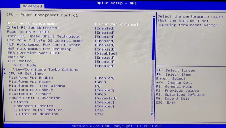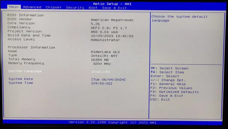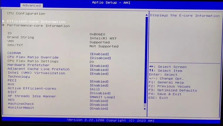 Le premier démarrage du mini PC est l'occasion d'aller faire un tour dans le BIOS. Ce dernier est complet et donne à l'utilisateur un bon contrôle sur la configuration de son ordinateur, grâce à la présence d'options de configuration avancées. Les photos offrent un aperçu du BIOS de la machine.