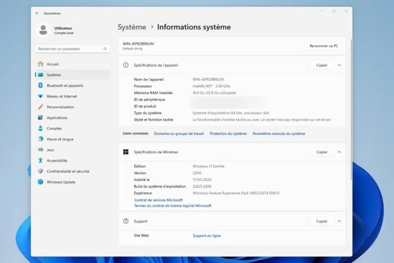 Remarque : comme à chaque fois, et peu importe la marque du PC, je vous recommande de réinstaller la machine avec une image propre et téléchargée depuis le site de Microsoft, si vous souhaitez continuer sur Windows. La configuration présentée ici est compatible Windows 11, donc la réinstallation ne posera pas de problème. Pensez à sauvegarder les pilotes au préalable pour faciliter leur réinstallation.