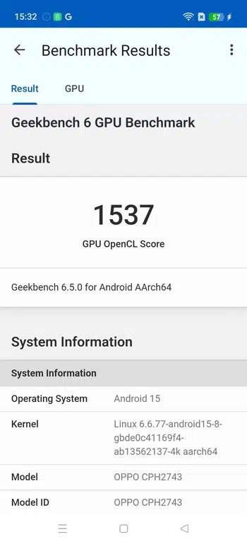 Ainsi que le résultat obtenu pour le GPU (graphique), toujours avec l'outil Geekbench :