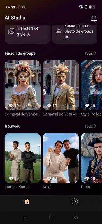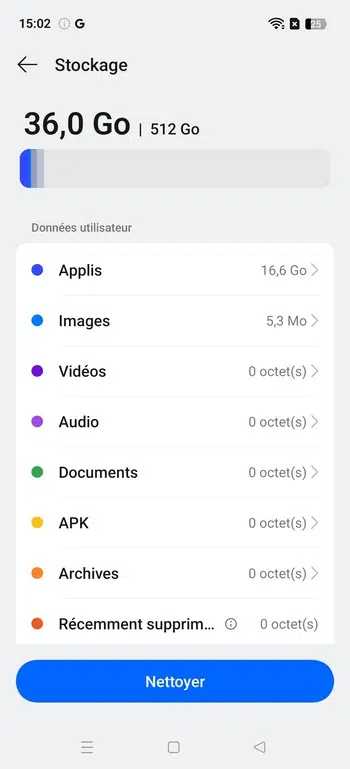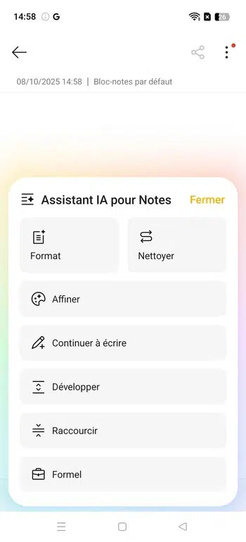 OPPO met beaucoup en avant l'intégration de l'IA, et il y a, en effet, des fonctionnalités présentes dans ColorOS. On peut notamment citer de l'aide à la rédaction, ainsi que pour la retouche des photos : l'AI Studio contient des mises en scène assez originale, mais il y a un système de crédits ! Vous avez aussi accès à l'IA de Google, Gemini, qui est un héritage direct d'Android. J'en profite aussi pour préciser que l'OPPO Reno14 FS 5G dispose de 512 Go de mémoire interne, dont 16,6 Go déjà occupés par les applications préinstallées !