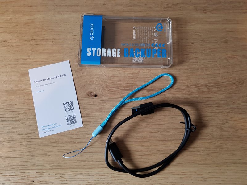 Encore en phase de développement, ce produit est livré dans une boîte blanche sans inscription. Par la suite, ORICO va surement imaginer une boîte aux couleurs de la marque. À l'intérieur de la boîte, nous retrouvons une notice en anglais, ainsi que le boîtier externe, une dragonne et un câble USB-C. Il est à noter que le boîtier n'est pas livré avec un disque.