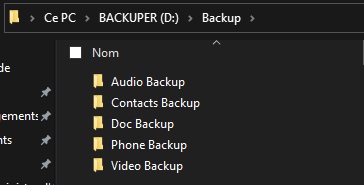 Si l'on connecte le Backup sur un PC, on peut accéder facilement au contenu des sauvegardes. Les données sont en libre accès sur le disque. Dans le dossier "Backup" du disque, nous retrouvons un sous-dossier par catégorie, comme ceci :
