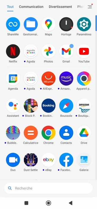Pour l'organisation de votre "Bureau" Android, vous pouvez positionner les applications vont vous le souhaitez, individuellement ou par dossier, tout en sachant que l'on peut modifier la grille (nombre d'applications par ligne, par exemple). Sinon, le listing de toutes les applications intègre une navigation par onglet où chaque onglet correspond à une catégorie d'applications (Tout, communication, divertissement, jeux, etc.).