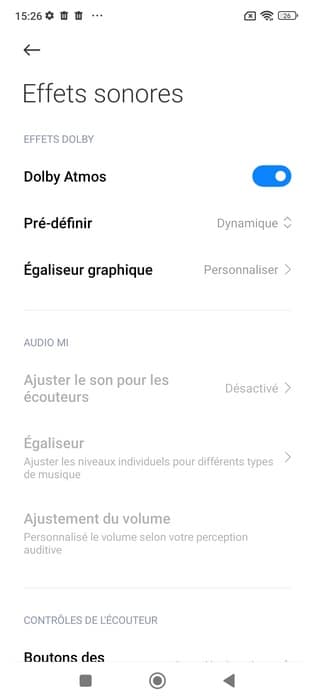 Au niveau audio, l'appareil est bien équipé, car il y a deux haut-parleurs afin de proposer de l'audio stéréo. De plus, dans les paramètres du système, nous pouvons accéder à un égaliseur et l'on peut constater la prise en charge du Dolby Atmos. De quoi exploiter la prise Jack 3,5mm en venant connecter son casque audio. Enfin, le paramètre "Toujours afficher" correspond à la fonction "Always On" et permet d'afficher une horloge et les notifications sur l'écran, sans avoir à réveiller l'appareil : c'est tout l'intérêt d'avoir un écran AMOLED. 😉