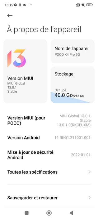 Le POCO X4 Pro embarque Android 11 dopé par l'interface MIUI 13 (version 13.0.1) avec les correctifs de sécurité de janvier 2022. Tout d'abord, ce que l'on peut constater c'est que l'appareil n'est pas livré avec Android 12 à sa sortie. Dommage. Pour le moment, il n'y a pas de mise à jour proposée.