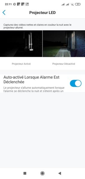 De jour comme de nuit vous pourrez faire de la vidéosurveillance, avec la vision infrarouge vous aurez une vue noir & blanc de ce qui se passe. Si vous préférez la couleur, vous devrez activer le projecteur. Il peut être activé manuellement ou se déclencher automatiquement si un mouvement est détecté. La lumière projetée est assez éblouissante, elle vous aveugle lorsque vous êtes en face. Cette puissance permet d’obtenir une très belle image une fois la nuit tombée. Ce n’est pas un simple gadget, je trouve cette option vraiment intéressante !
