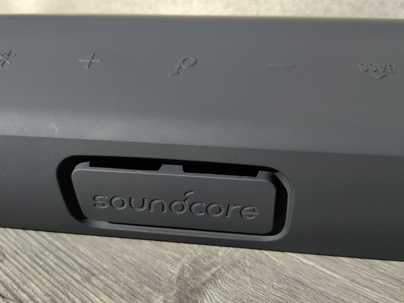 De profil, on constate une inclinaison de l'enceinte : ce n'est pas anodin. Soundcore explique que cet angle de 15° sert à optimiser la diffusion du son. Cette enceinte embarque des tweeters doubles, des woofers et des radiateurs passifs. D'ailleurs, sur le côté droit se situe le bouton on/off rétroéclairé ainsi que l'accès aux ports USB-C et AUX, le premier étant utile pour recharger l'enceinte. L'accès est protégé pour maintenir l'étanchéité de l'enceinte.