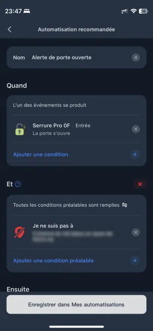 Si vous souhaitez mettre en place des scènes et des automatismes, rien de plus simple, l’application est bien fournie. Grâce aux modèles implémentés dans celle-ci, vous pouvez, par exemple, utiliser la géolocalisation pour verrouiller ou déverrouiller votre porte automatiquement en fonction de votre position. Vous pouvez aussi générer des alertes d’ouverture de porte, de verrouillage ou déverrouillage, etc… En y ajoutant d’autres conditions suivant les besoins.