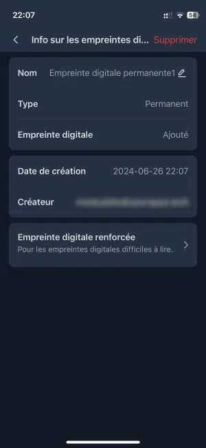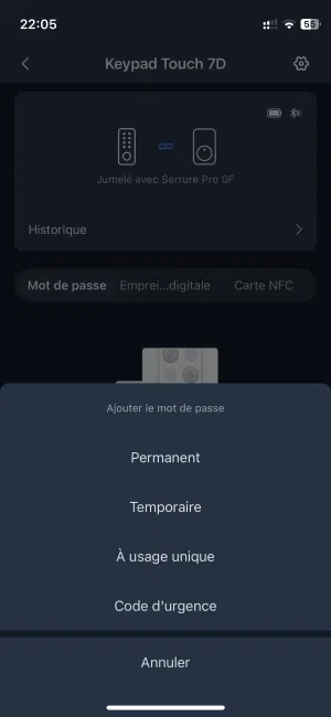Puis, vous avez accès à l’enregistrement des éléments de déverrouillage possible. En premier la gestion des mots de passe puis la gestion des empreintes (jusqu’à 100 empreintes) et pour finir l’enregistrement des cartes (cartes fournies par SwitchBot obligatoires : code NFC - NTAG 216, jusqu’à 100 cartes). L’ajout d’éléments est très simple, dans chacune des options, vous avez un + permettant l’ajout. Ensuite, il suffit de suivre le guide.