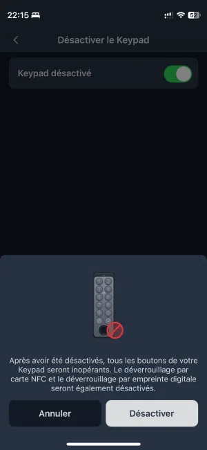 Dans le menu paramètre (engrenage), vous disposez des éléments tels que le réglage du verrouillage avec le bouton disponible sur le Keypad (en bas à gauche de celui-ci), la désactivation du Keypad, les alertes de suppression (en cas d’arrachage du keypad de son support), le rétro-éclairage et son, l’appareil jumelé (que vous avez sur le tableau de bord), la liaison avec le HUB (non obligatoire).