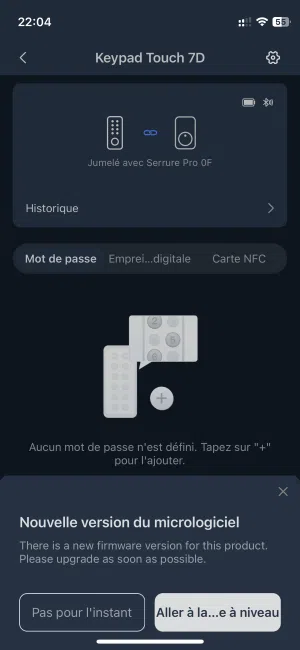 Dès que vous mettez en fonctionnement pour la première fois la serrure, celle-ci passe en mode appairage, ce qui permet d’être détecté rapidement par l’application (détection par Bluetooth). Dès que la serrure est intégrée, une vérification du firmware est effectuée. Dans mon cas, une mise à jour a été proposée.