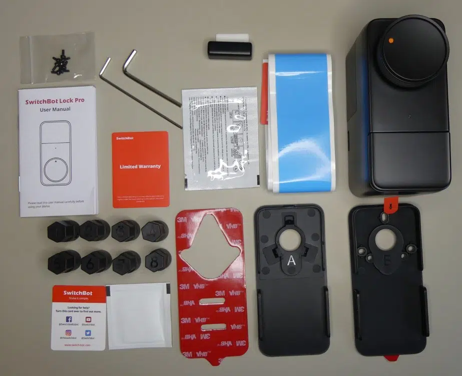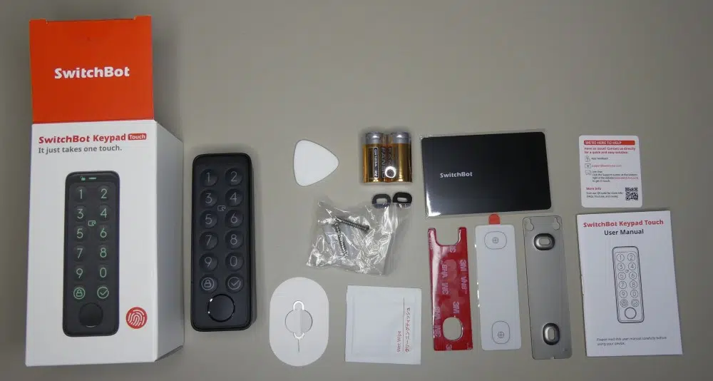 Comme pour les autres produits de la marque, les éléments fournis avec la serrure sont complets. Là où d’autres fabricants mettent en option les capteurs d’ouverture et les cartes NFC ou jetons, SwitchBot les intègres avec celle-ci (au moins un exemplaire, une carte NFC est incluse avec le Keypad et le capteur est intégré à la serrure).
