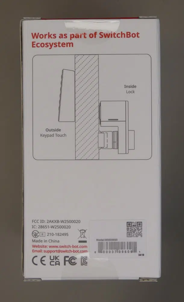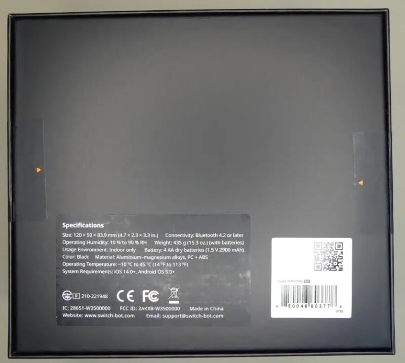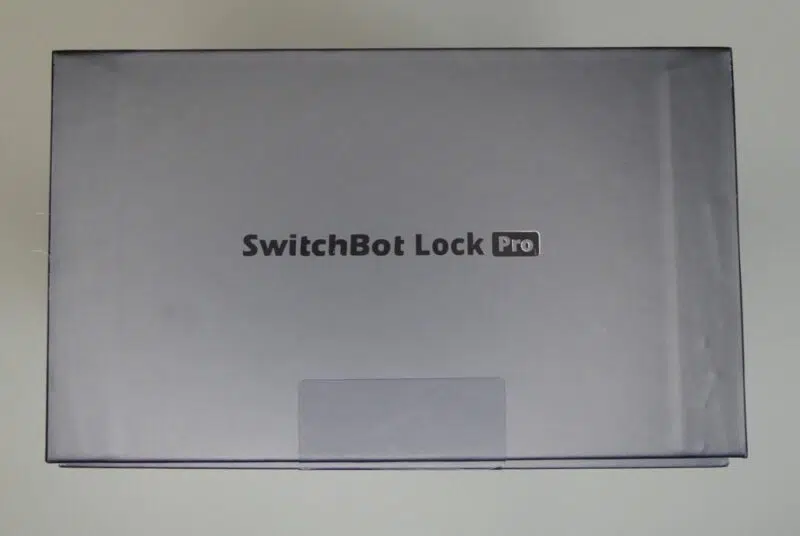 Pour la Lock Pro, SwitchBot a complètement fait évoluer son emballage. SwitchBot est parti pour un emballage noir mat, avec comme informations, le strict minimum. Vous retrouvez la forme du produit sur la face avant en noir brillant, sur les côtés droit et gauche, la marque et modèle aussi en noir brillant et derrière les spécifications techniques du produit.