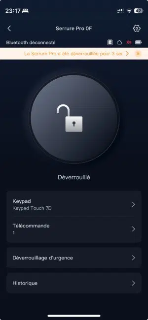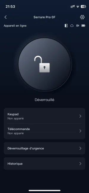 Nous continuons avec les accessoires couplés. En premier lieu, c’est le Keypad qui est notifié, puis une télécommande (que ce soit paramétré ou non, ces éléments sont toujours présents). Les deux dernières fonctions de la page principale sont une aide pour un déverrouillage d’urgence (non testé) et l’historique.