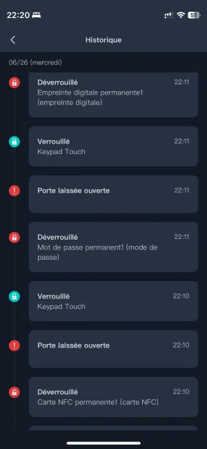 Dans l’historique, tout est enregistré : Date et heure bien sûr, l’état de la porte et les différents types de verrouillage/déverrouillage (Manuel, Télécommande, l’Application, Matter, verrouillage par le Keypad, déverrouillage par mot de passe, carte NFC ou encore empreinte).