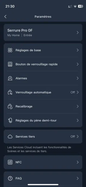 Dans le menu de paramétrage (symbole engrenage en haut à droite de l’écran), la liste des options de configurations s’allonge. Parmi elles, il y a les réglages de base pour la partie lumière et son, le mode de fonctionnement du bouton de verrouillage rapide (simple ou double pression, verrouillage seulement, etc…), la partie alarmes comme mentionnée plus haut, le recalibrage, le mode de verrouillage automatique (suivant une durée), l’association des tags NFC. Il y a aussi les services tiers appelés aussi les services Cloud : Google Assistant, Amazon Alexa, IFTTT, Raccourcis Siri.