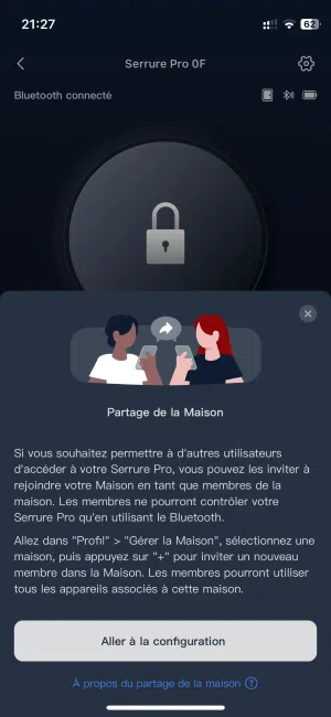 Une fois la configuration initiale terminée, l’application vous propose directement le partage de la maison afin de mettre la serrure à disposition des autres membres du foyer. Vous n’êtes pas obligé de la faire à cet instant, vous retrouvez la fonction de partage de la maison dans le menu Profil -> Partage de la maison -> Votre maison -> cliquer sur le + de Membres de la maison. Un code sera généré et il vous est proposé de l’envoyer à la personne concernée (Celle-ci doit disposer de l’application afin d’aller, elle aussi, dans le menu de partage et saisir le code envoyé).