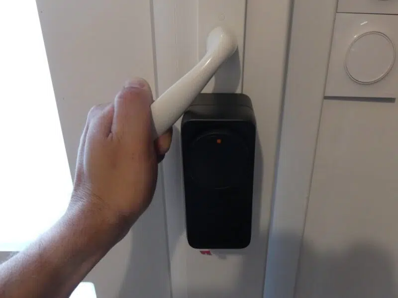 Comme vous pouvez le remarquer sur la photo ci-dessus, il faut bien tester les distances indiquées dans la notice, surtout si vous avez une porte épaisse comme la mienne. Bien que l’aimant ne soit pas en face de la serrure, cela fonctionne.