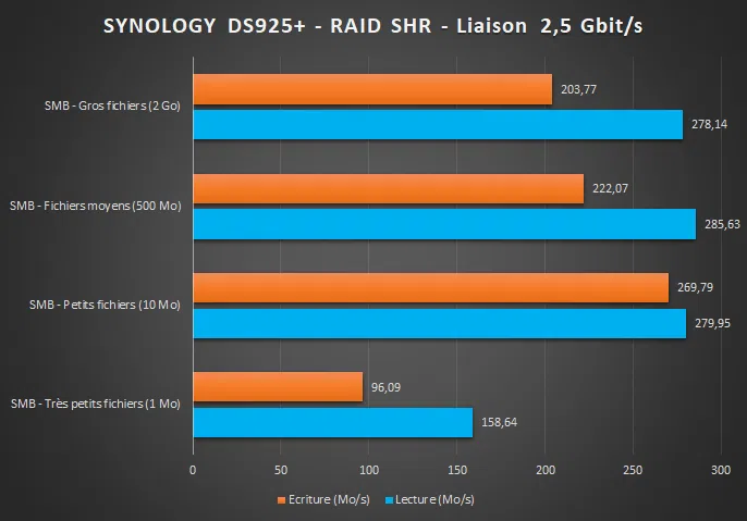 Remarque : sur son site, Synology annonce un débit de 522 MB/S en lecture et 565 MB/S sur un volume avec des disques durs, non chiffré et en sollicitant les deux liens réseau, soit 5 Gbit/s.