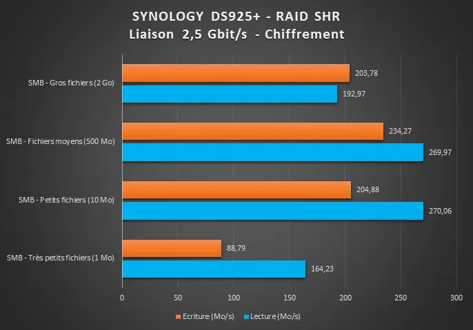 Le test de débit ci-dessous a été réalisé via une connexion SMB, vers un partage chiffré. L'ajout du chiffrement a un impact faible sur les performances, même si cet impact est plus significatif sur les petits fichiers.