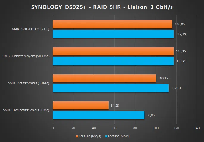 Le test de débit ci-dessous a été réalisé via une connexion SMB, vers un partage non chiffré. Cela donne un aperçu des performances attendues, en mono-lien, pour ceux qui sont sur un réseau 1 Gbit/s.