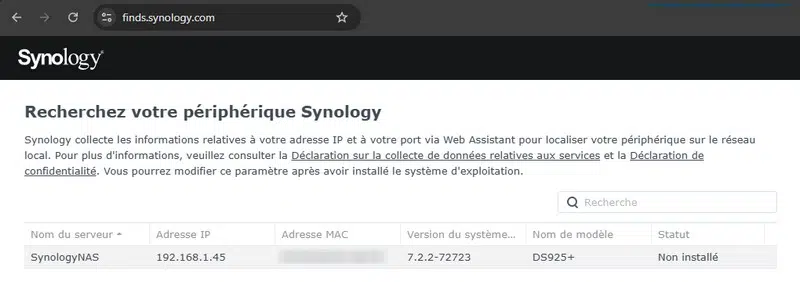 La mise en route s'effectue à partir d'un navigateur, après avoir identifié l'adresse IP du NAS. Pour cela, l'administrateur peut se rendre sur le site finds.synology.com pour détecter le NAS Sur le réseau. Au bout de quelques secondes, il apparaît bien et il peut être initialisé.