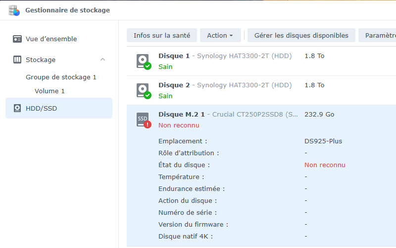 J'ai tenté d'installer un SSD M.2 de marque Crucial dans le NAS pour effectuer des tests de performance avec un cache SSD, mais le disque n'est pas accepté. Dommage. Cela met en évidence les nouvelles restrictions imposées par Synology.