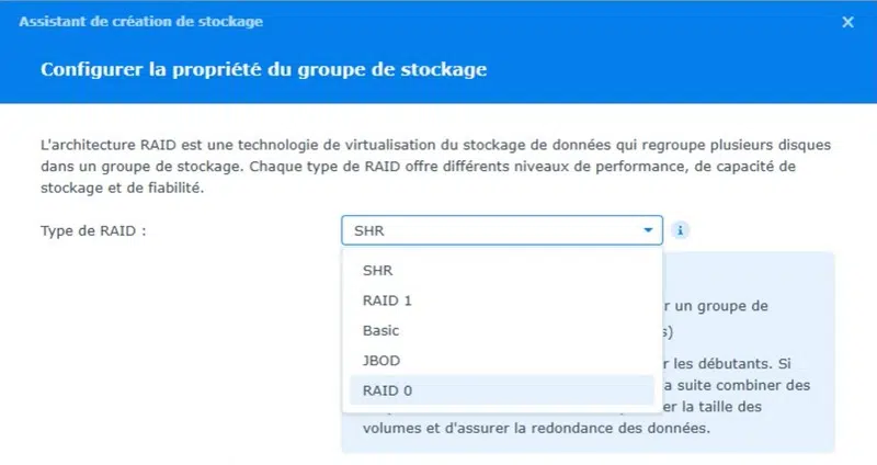 Ceci consiste à notamment à choisir le type de RAID parmi plusieurs modes proposés, ainsi que la capacité de l'espace de stockage. Le SHR (Synology Hybrid RAID) est un type de RAID conçu par Synology. Vous devez également choisir le système de fichiers : je vous recommande d'utiliser Btrfs pour bénéficier des clichés instantanés. C'est une fonctionnalité très intéressant pour assurer la sécurité de vos données, notamment face aux logiciels malveillants.