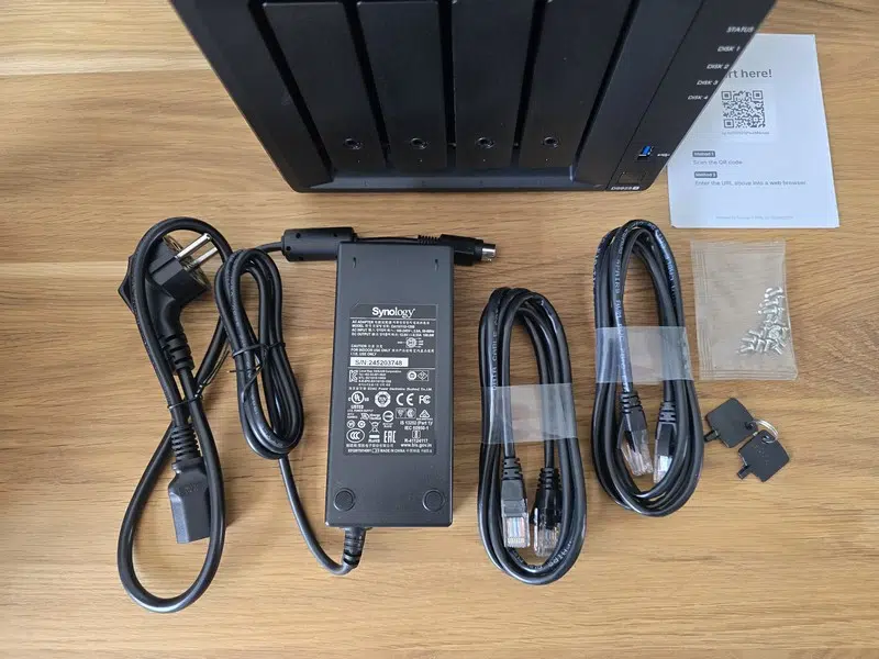 Le NAS est accompagné par un guide d’installation numérique accessible en scannant un QR code, une alimentation externe de 100 Watts avec son câble d'alimentation, ainsi que deux câbles Ethernet RJ45. Nous avons aussi le droit à des vis, ces dernières étant utiles pour les disques 2.5 pouces, et 2 clés pour verrouiller les baies de disques.