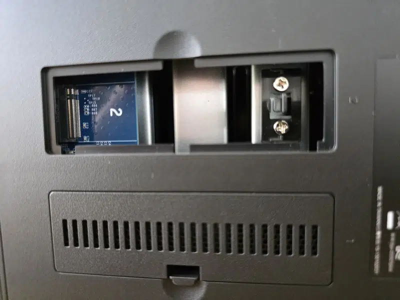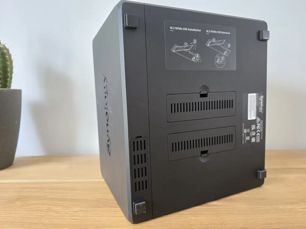 Pour accéder aux emplacements et installer les SSD NVMe, il faut retourner le NAS et ouvrir les compartiments. Là encore, il n'y a pas besoin d'outil. L'installation de disques SSD NVMe est facultative, mais elle peut s'avérer utile pour améliorer les performances du NAS, notamment grâce au cache.