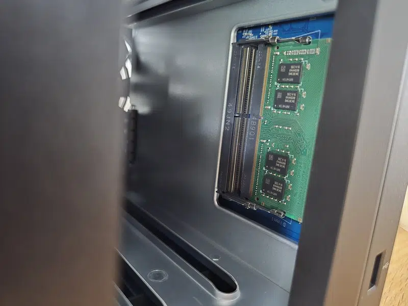 L'ajout de RAM quant à lui s'effectue par l'intérieur du boitier, après avoir retiré les baies de disques. Les slots de RAM sont directement accessibles. Il y a un slot de libre, ce qui permet de rajouter une barrette de RAM supplémentaire sans avoir à retirer la barrette déjà en place.