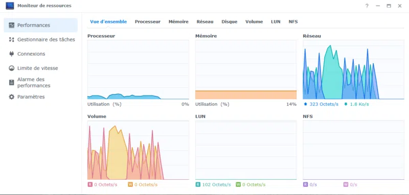 J'ai observé la charge globale du NAS lors de transferts de fichiers intensifs vers un partage chiffré. Les graphes ci-dessous montrent que le NAS réagit parfaitement à la sollicitation puisque la RAM consommée est de 14% et le CPU ne dépasse pas 6% d'utilisation. Ce NAS reste silencieux, même lorsqu'il est en pleine charge, même si nous entendons tout de même les disques "gratter".