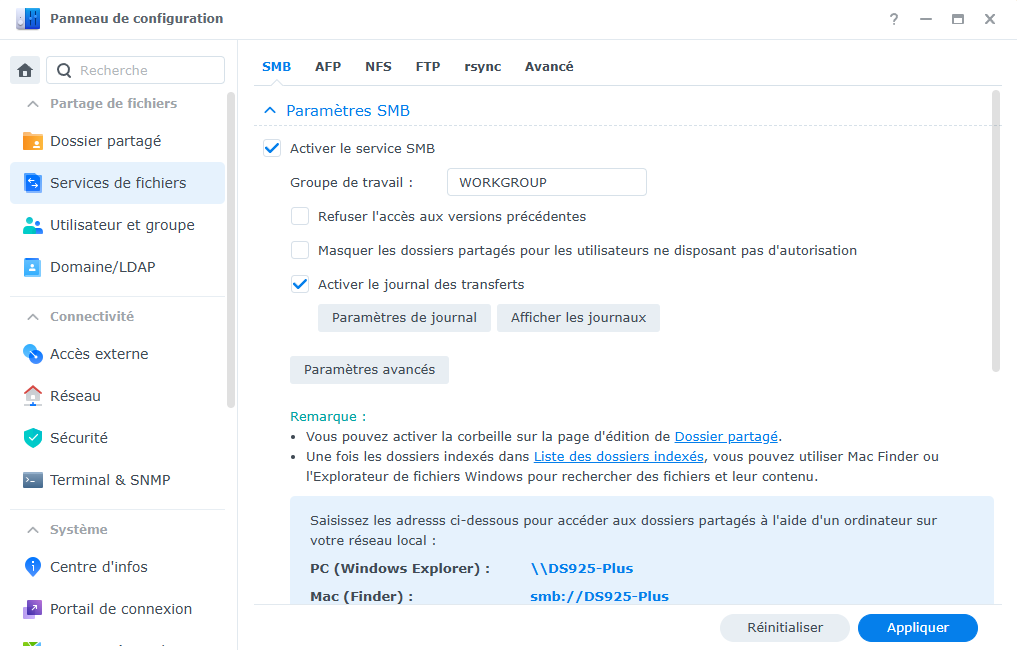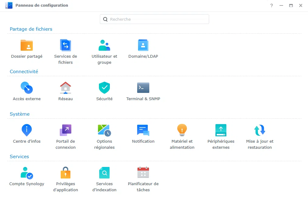 L'interface de DSM est votre alliée pour créer vos partages de fichiers, vos utilisateurs, vos groupes et mettre à disposition des services auprès de vos utilisateurs. Ce système est fiable et très bien documenté sur Internet. Le NAS peut être utilisé en tant que serveur de fichiers (stocker et partager des fichiers), comme service applicatif ou en tant que support pour stocker des sauvegardes.