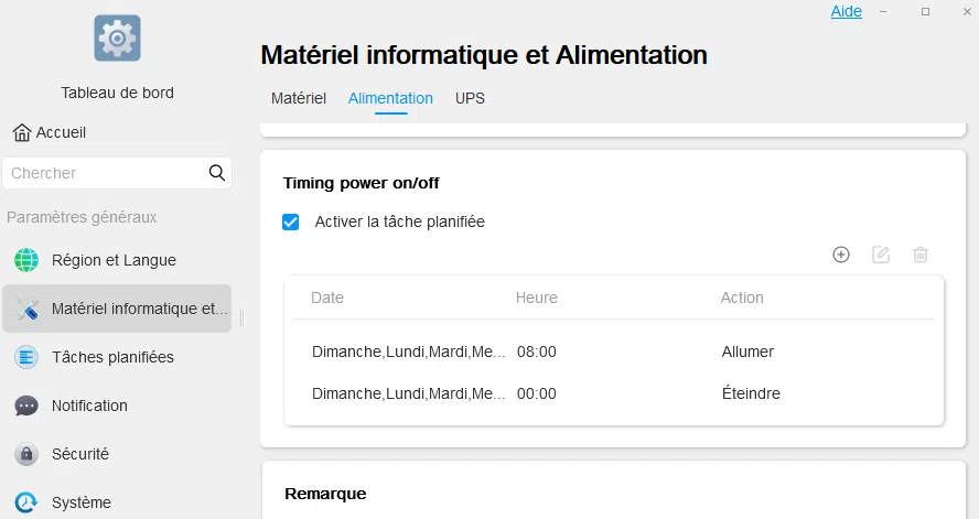 Pour terminer, dans les fonctionnalités pratiques pour la maison, vous avez la possibilité de planifier le démarrage et l'extinction de votre NAS, selon un planning précis (jour de la semaine et heure). Pratique si vous voulez faire quelques économies d'énergies 😊: