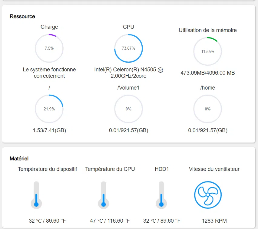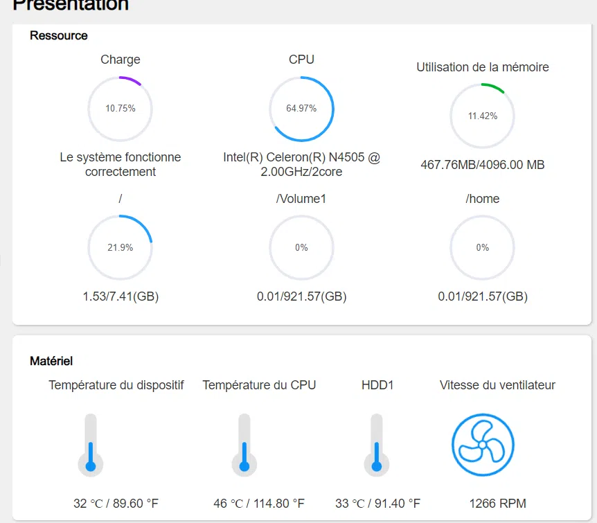 Il y a un écart de performance assez important sur la copie de très petits fichiers. Le CPU s'emballe parfois pendant les transferts en faisant des pics à plus de 70%, mais cela reste ponctuel. Malgré la montée en charge du CPU, la charge globale du système reste aux alentours des 10%. Petit plus le NAS est très silencieux ! Pour ma part, je l'ai installé dans mon salon et il passe inaperçu.