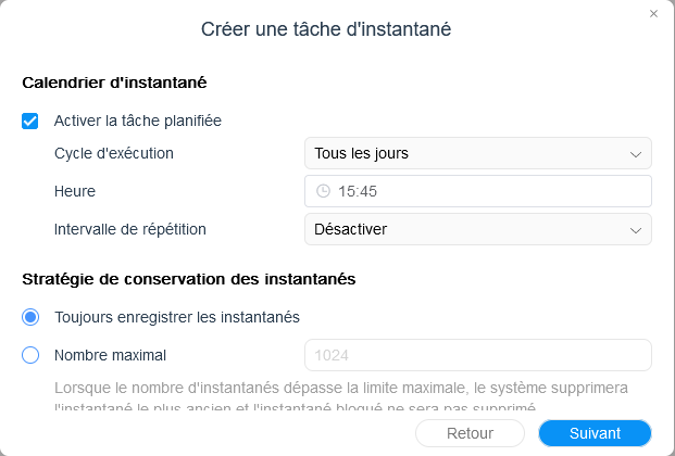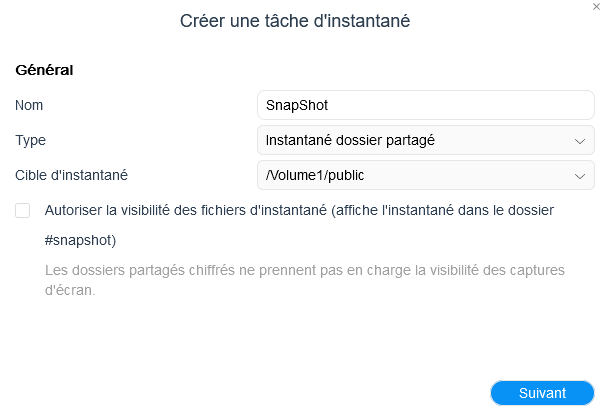 Pour mettre en place un snapshot sur un dossier, vous devez tout d'abord installer la fonctionnalité depuis le menu Backup, puis vous pourrez vous lancer dans la configuration qui consiste simplement à choisir un dossier partagé à protéger, la fréquence d’exécution du snapshot ainsi que l'historique à conserver. Il y a des limites sur le nombre de snapshots réalisables, mais elles ne sont pas bloquantes : 1,024 snapshots peuvent être crées par dossier partagé et l'appareil peut supporter au maximum 65,536 snapshot au total. Chaque instantané ne requiert que quelques dizaines de Ko d'espace de stockage.