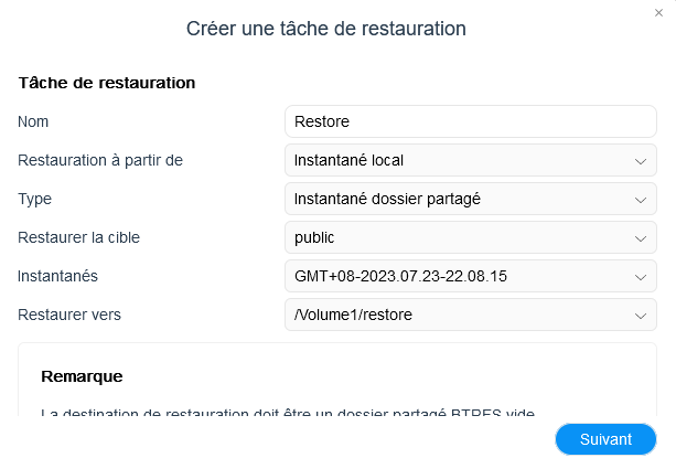 Sinon, vous pouvez lancer une tâche de restauration de données depuis l'interface web du NAS. L'inconvénient est que la restauration des données doit se faire dans un dossier partagé BTRFS vide. Il n'y a pas la possibilité de restaurer les données dans le répertoire d'origine, ce que je trouve dommage dans le cas d'une suppression accidentelle d'un utilisateur. Cette option ne permet de faire de restauration granulaire, le dossier sera restauré dans sa totalité.