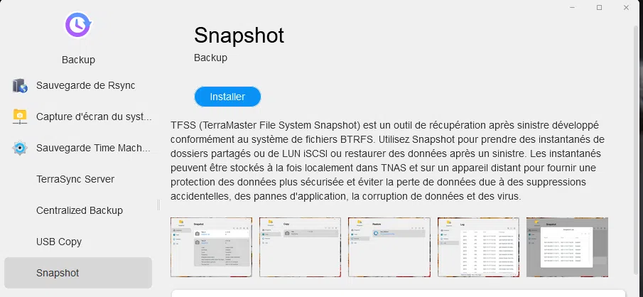 Pour protéger vos données, le système TOS5 intègre des fonctionnalités de snapshot. TerraMaster Snapshot permet de faire des clichés instantanés d'un dossier et TFSS pour TerraMaster File System Snapshot, ce dernier se base sur le système BTRFS et permet comme son nom l'indique, de faire une photo à l'instant t du système de fichier. C'est simple à mettre en place, nous allons d'ailleurs voir cela ensemble.