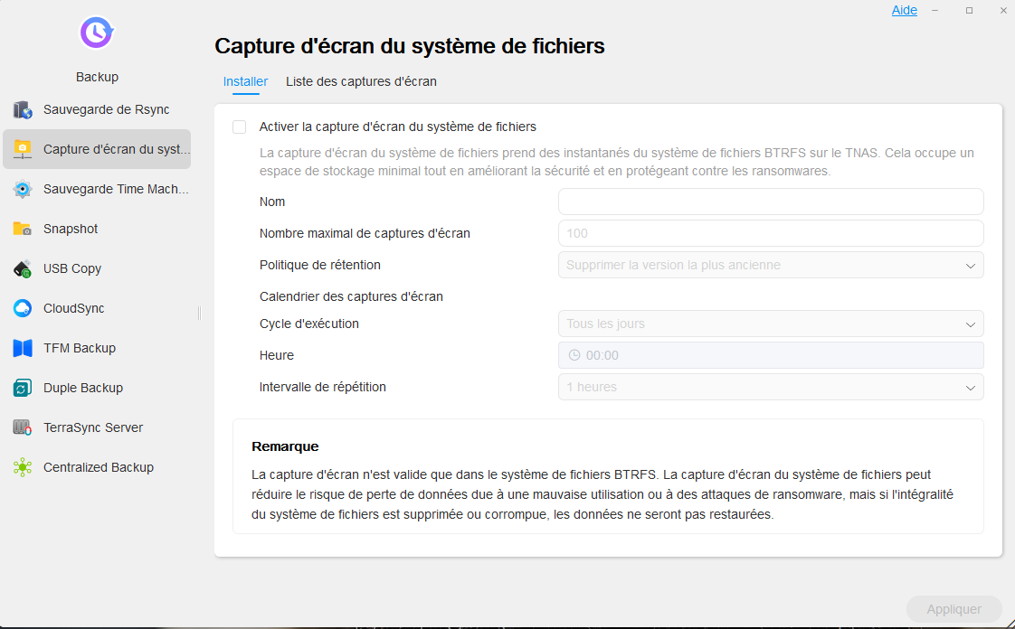 Les snapshots sont une des possibilités pour protéger un dossier partagé ou l'ensemble de votre système. Si vous souhaitez externaliser vos données, d'autres applications sont à votre disposition pour faire des copies vers un lecteur USB, au NAS TerraMaster distant ou bien vers un Cloud provider (Google Drive, OneDrive, Amazon S3, DropBox, Alibaba Cloud OSS, Box, MegaDisk, OpenDrive, Pcloud, Yandex Disk Backblaze B2). Cela vous permet d'avoir un système de sauvegarde respectant le système de sauvegarde 3-2-1.