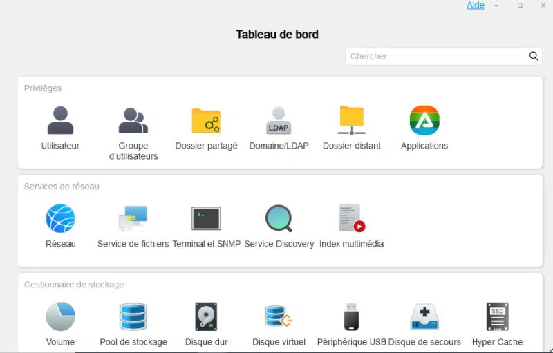 L'interface est moderne et ressemble à ce que la concurrence peut proposer, ce qui fait que nous ne sommes pas perdus. L'ensemble de la configuration est accessible à travers le "Tableau de bord", celui-ci est découpé en catégorie "Privilèges", "Services de réseau" et "Gestionnaire de stockage", une barre de recherche est également disponible pour trouver les éléments plus rapidement.