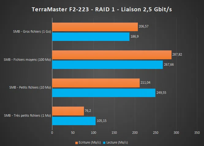 Mis à part cela, nous pouvons constater une réelle différence entre les deux types de connexions. Les ports 2,5Gb/s proposés par TerraMaster offrent un débit très intéressant. En supplément, nous avons la possibilité de faire un agrégat des cartes réseau, ce qui permet avec un switch compatible de doubler le débit. Soit un lien de 5 Gbit/s.