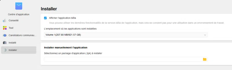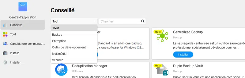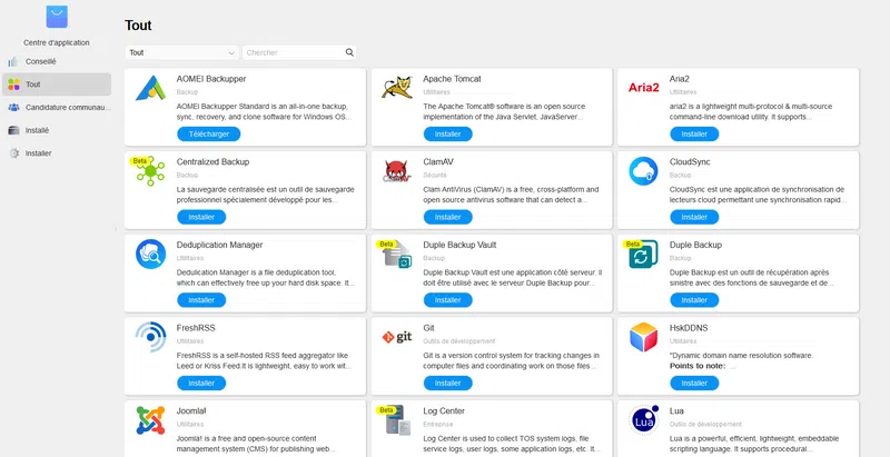 Si vous souhaitez installer des applications, vous devrez passer par le "Centre d'Application" qui proposent des applications regroupées par catégories : Backup, Entreprise, Outils de développement, Multimédia et Sécurité.