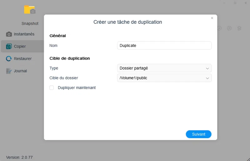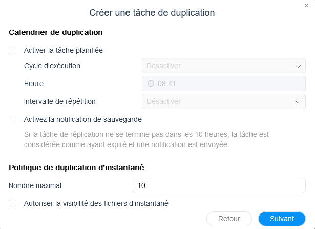 Pour assurer une protection supplémentaire, vous avez la possibilité de dupliquer vos snapshots soit vers un nouveau dossier en local, soit l'externaliser vers un autre NAS Terramaster. La tâche de duplication peut être planifiée afin qu'elle soit exécutée de façon récurrente.